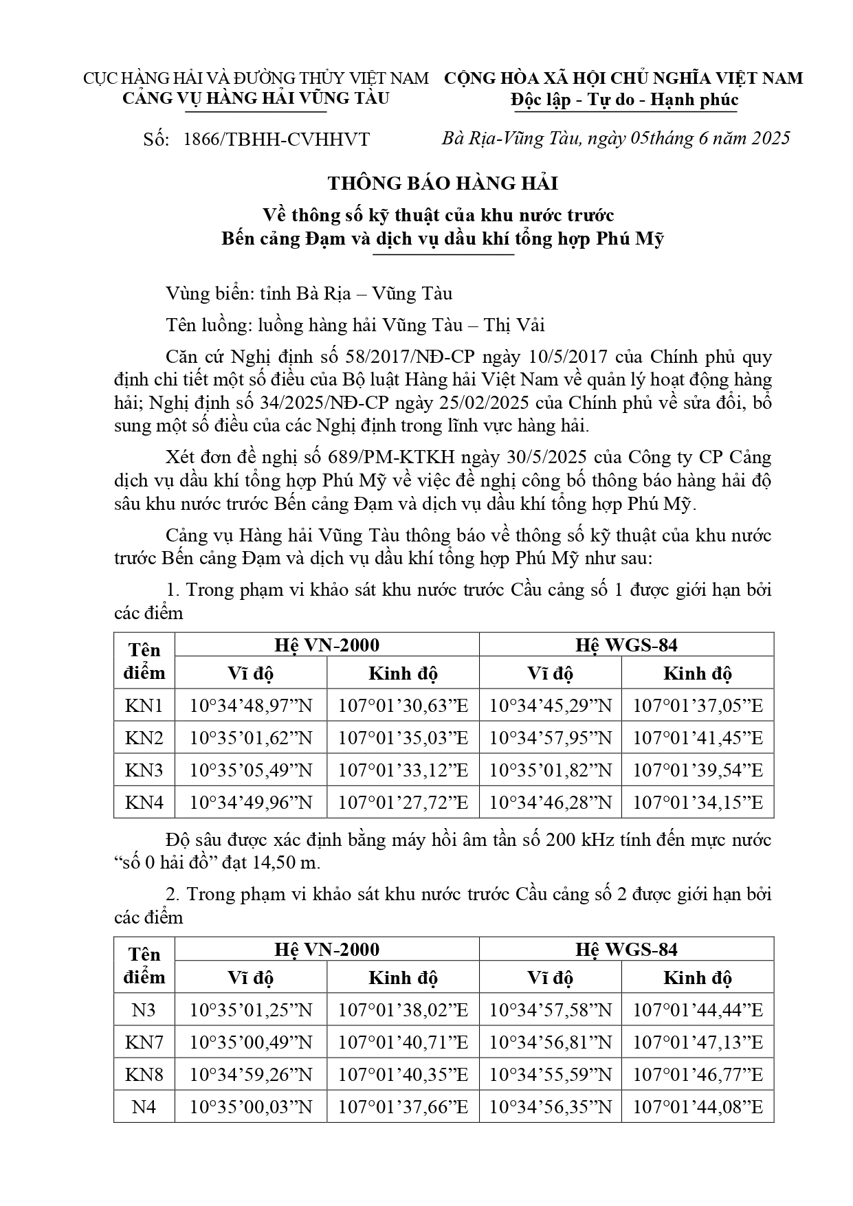 THÔNG BÁO HÀNG HẢI VỀ THÔNG SỐ KỸ THUẬT VÙNG NƯỚC TRƯỚC CẦU CẢNG DẦU NHÀ MÁY ĐIỆN PHÚ MỸ 1 (01/07/2025)
